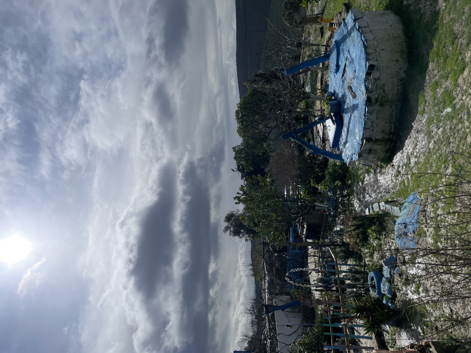 A whimsical scene captures a vibrant blue structure, possibly a playground feature, against a backdrop of lush greenery. Weathered stone and blue-painted supports suggest a creative, perhaps repurposed, design. The sky above is filled with dynamic cloud formations, contrasting sharply with the bright sun peeking through. The image is taken at an angle, emphasizing the height of the structure and the vastness of the sky.