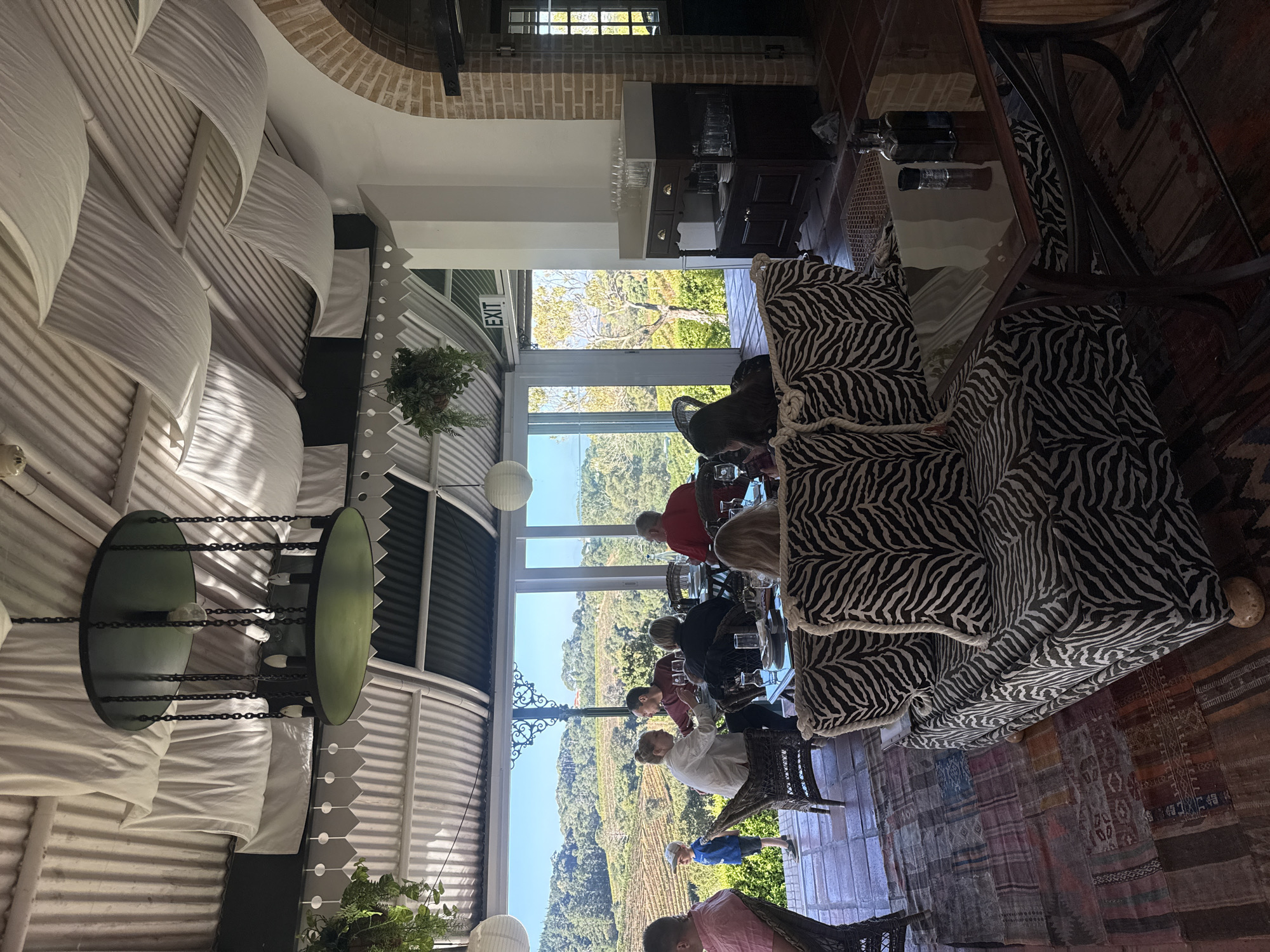 interior of a restaurant, with a view of vineyards visible through large windows. Patrons are seated at a table, dining. The interior decor is notable for its zebra-striped chairs and a unique ceiling design with white fabric sections. The location, based on the landscape, is likely in or near the winelands outside the city of Cape Town, South Africa.