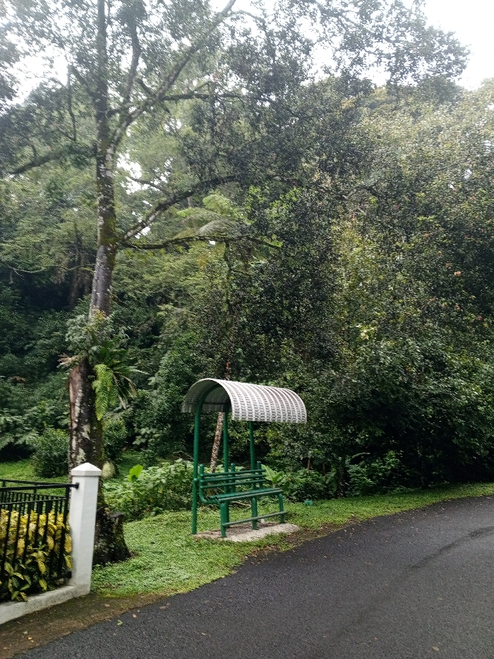 A green bench with a curved metal roof stands beside an asphalt road, surrounded by lush greenery. The scene is dominated by tall trees and dense foliage, creating a natural, secluded atmosphere. A white fence with decorative ironwork is visible to the left of the bench. The setting appears tranquil and somewhat secluded.