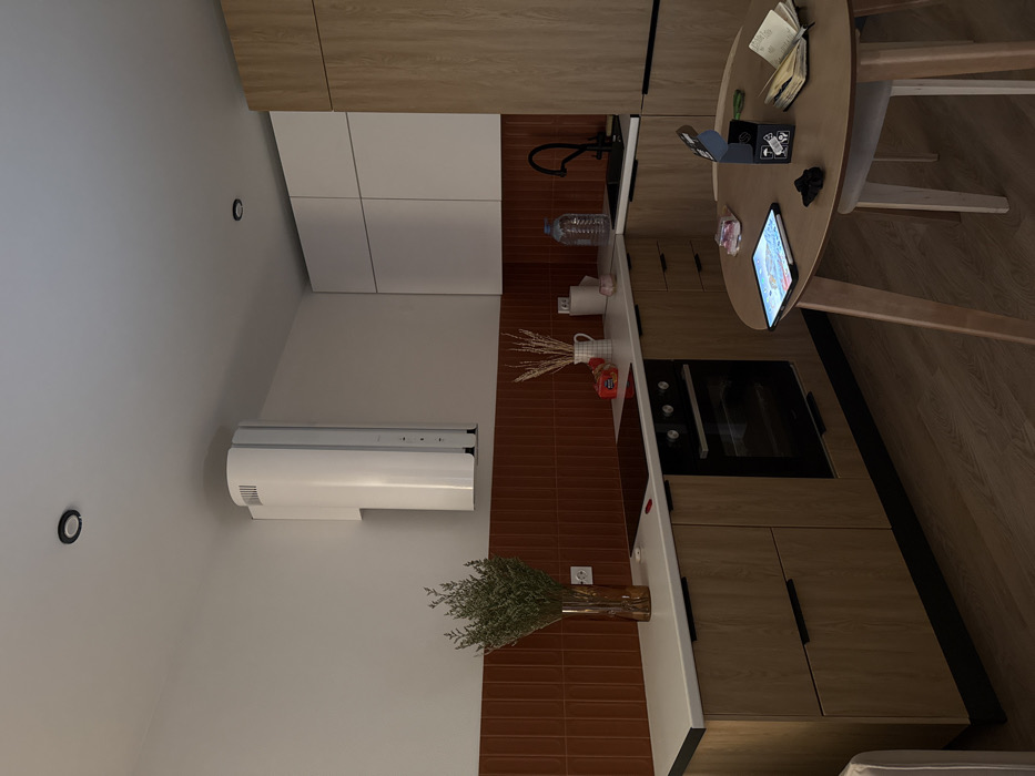 This image depicts a modern, unoccupied kitchen and dining area, located in a residence within Moscow, Russia. The kitchen features an L-shaped counter with light wood-grain base cabinets and white overhead cabinets, contrasting with a terracotta-colored vertical subway tile backsplash. A white countertop spans the kitchen perimeter. Appliances include an integrated black electric hob, an oven directly below it, and a prominent white cylindrical wall-mounted range hood above the hob. A black sink with a black gooseneck faucet is positioned in the corner. On the countertop, visible items include a large clear plastic water bottle, a white checkered pitcher containing dried wheat stalks, a small pink candle, and some red-packaged goods. To the left, a tall brown glass vase holds green foliage. The walls are painted a light, neutral color, and the ceiling features recessed lighting fixtures. In the foreground, a light wood-grain round dining table with matching splayed legs is situated. On its surface, an illuminated tablet rests, displaying content. Adjacent to it, an open, small, light-colored notebook is present. Other items on the table include a small black cardboard box, several small dark irregular objects (possibly charcoal or stones), and a clear plastic container with internal contents. A single white dining chair is partially visible under the table. The flooring throughout the space is a light wood laminate. The overall lighting is dim, suggesting evening or interior artificial illumination.