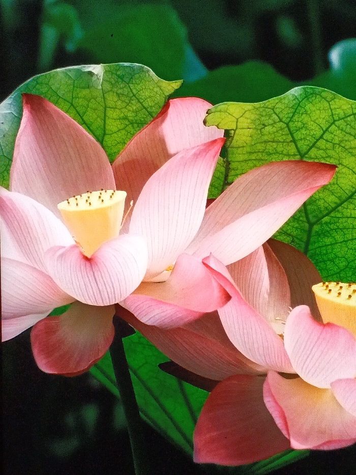 Two pink lotus flowers bloom amid lush green foliage