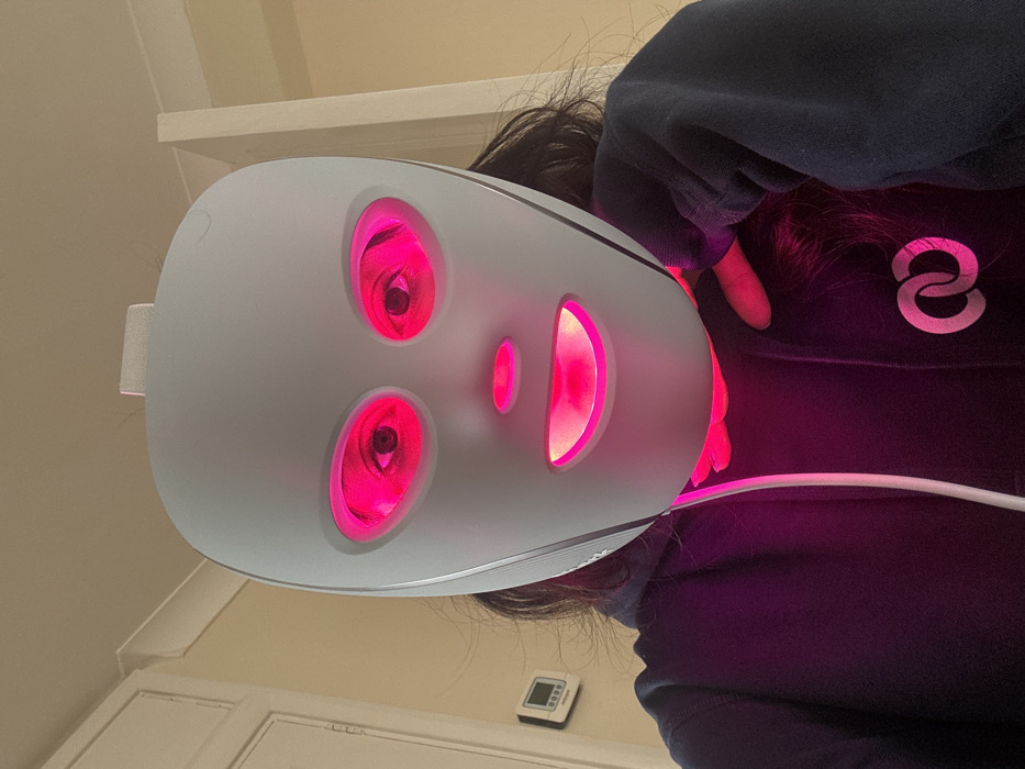 A single individual is depicted in an indoor setting, ostensibly within the city of London, United Kingdom. The person is wearing a light gray LED light therapy face mask that emits a prominent bright pink-red light from the eye, mouth, and lower facial openings. The light intensely illuminates the user's visible eyes, which are dark, and parts of their neck and chin. Dark hair is visible around the mask. The individual wears a dark blue or black hooded sweatshirt featuring a light-colored logo, resembling two interlocking circles, on the front. A white power cable extends from the left side of the mask, running down over the sweatshirt. The person's left hand is positioned near their neck area, partially illuminated by the mask's glow. The background reveals elements of a room, including a white doorframe, white crown molding, and a wall-mounted white thermostat or control panel on a light-colored wall.