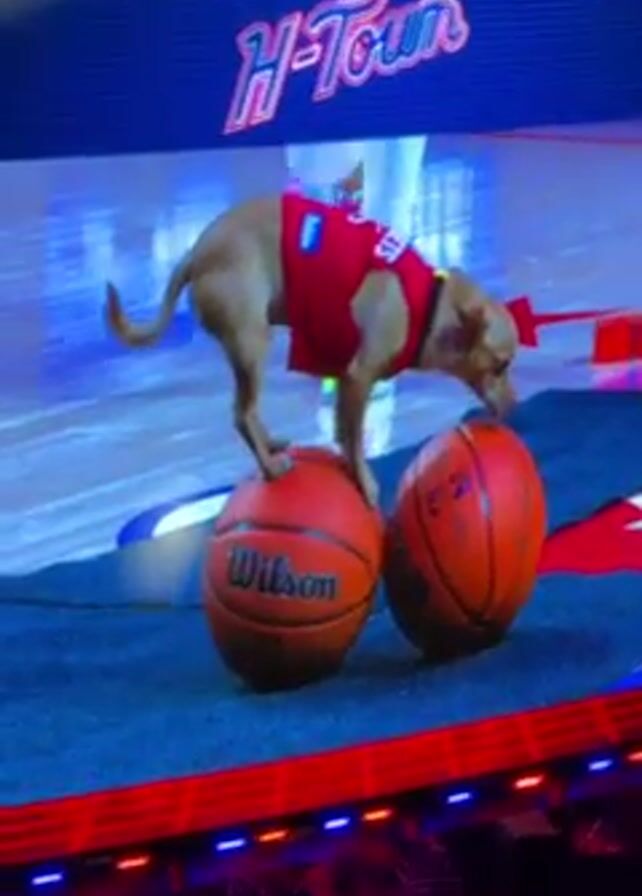 A tan dog wearing a red jersey is shown standing on two basketballs on a large screen at the Toyota Center, which is displaying "H-Town" at the top