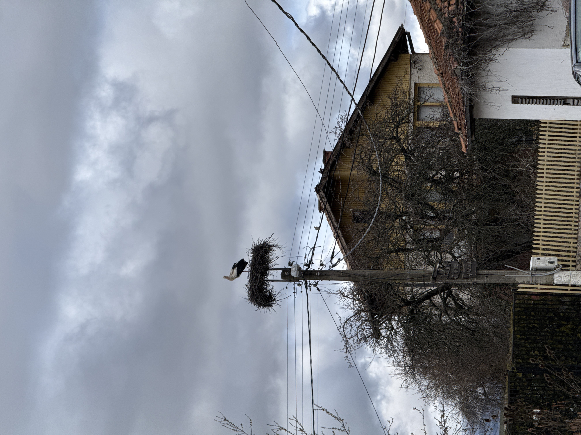 This image depicts a residential street scene in Galabovtsi, Bulgaria, under an overcast sky. The central focus is a large white stork standing in a substantial stick nest built atop a grey concrete utility pole. The stork is positioned facing right, exhibiting its white body plumage and black flight feathers. Multiple black utility wires extend horizontally from the pole, crossing the frame. Behind the utility pole and nest, a two-story house with light yellow siding and a brown roofline is visible, partially obscured by dense, bare tree branches. To the right and foreground, a white, single-story building with a red terracotta tile roof features a small, dark, louvered window or vent and numerous dead vines hanging from its eaves. A dark vehicle's roof and windshield are partially visible beside this white structure. At the base of the utility pole, a grey utility box or meter is affixed, and several dark wooden signs with unreadable white Cyrillic text are mounted higher on the pole. The foreground also shows sections of fencing: a dark, possibly metal fence on the left and a light-colored, wooden picket fence running horizontally. The overall environment suggests an early spring or late autumn day, characterized by the bare trees and muted lighting. No human figures are present.