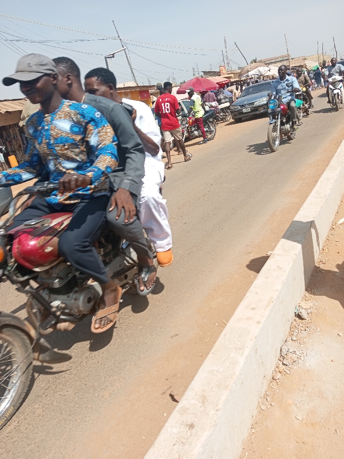 The image displays a bustling street scene in Akwanga, Nigeria, under clear, bright daylight. In the foreground, three adult males are seated on a red motorcycle, moving from right to left across the frame. The operator wears a grey baseball cap, a blue and brown patterned long-sleeved shirt, dark trousers, and light brown sandals. A second male, dressed in a dark grey long-sleeved shirt and dark trousers with dark sandals, sits directly behind the operator. The third male, wearing white traditional attire and orange sandals, occupies the rearmost position. The road is a light grey-brown paved surface, separated from an unpaved shoulder on the right by a low concrete curb. In the midground, multiple individuals and vehicles are present. A dark blue sedan is partially visible behind a group of people and several parked motorcycles on the left side of the road. To the right of the sedan, a man in a light blue collared shirt and dark trousers operates a red motorcycle with chrome accents, moving in the same direction as the foreground motorcycle. Other pedestrians are observed standing or walking along the roadside, including a man wearing a red jersey with the number "18" on its back, light-colored shorts, and sandals. A red market umbrella or canopy is visible further back on the right side of the road, near more individuals. The background features low-rise buildings with light-colored walls and corrugated metal roofs, indicative of commercial or residential structures lining the street. Overhead utility lines traverse the upper portion of the frame against a pale blue sky. Strong shadows on the ground confirm sunny conditions.