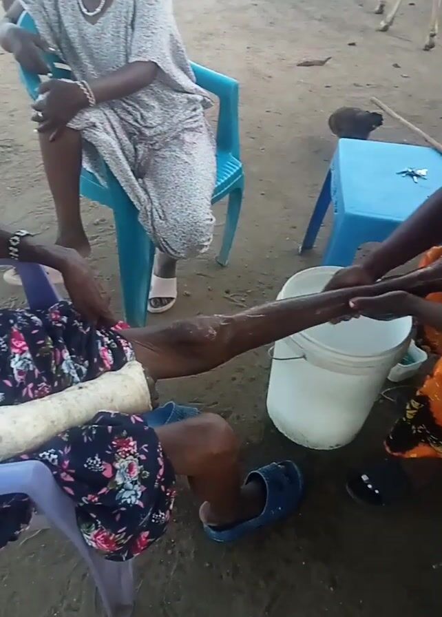 The scene shows three people sitting on plastic chairs, one of whom is having their leg attended to by another person. The person attending to the leg is wearing an orange and black patterned dress. The person whose leg is being attended to is wearing a black dress with a floral print. Their leg is wrapped in what appears to be a bandage. A third person is sitting in a blue chair, wearing a long-sleeved gray dress with a small print. A white plastic bucket is situated between the people, and a blue stool is near it. Outside, there are livestock and what appears to be a dirt ground. The lighting is natural, suggesting an outdoor setting.