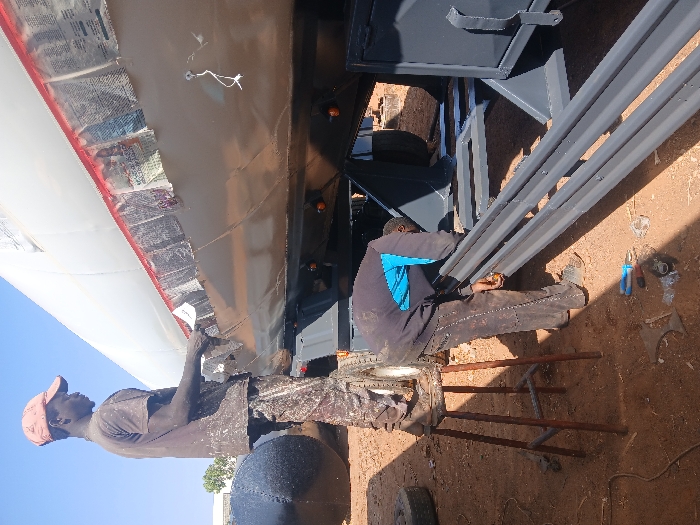 In Unguwar Saya, Nigeria, an outdoor industrial scene depicts two males working on a large, cylindrical tanker truck in an area with reddish-brown dirt ground