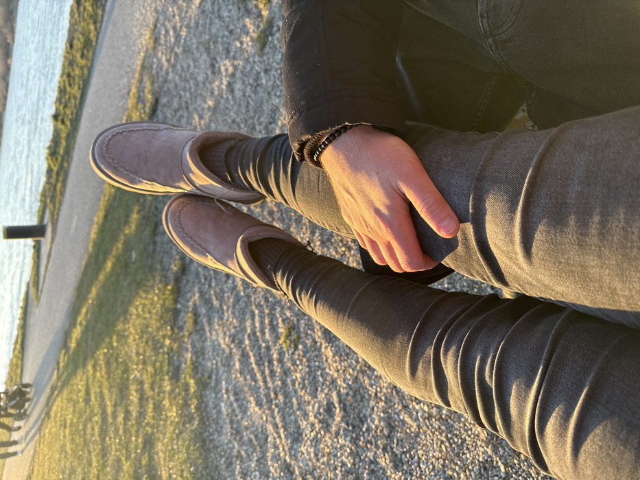 The image displays a close-up, downward-angled view of two individuals seated or reclining by the Danube river in Hainburg an der Donau, Austria, illuminated by golden hour sunlight. In the foreground, a person's legs are extended, clad in dark grey jeans and light tan, fur-lined ankle boots with prominent stitching and visible black socks. Adjacent, the right hand of a second individual, wearing a black beaded bracelet, rests upon the thigh of the first person, who is also wearing dark grey jeans. The immediate ground surface beneath the subjects consists of light-colored gravel. In the blurred background, a paved pathway runs parallel to a wide, sunlit body of water. Along this pathway, several indistinct figures, including at least two adults and a stroller, are observable walking, casting long shadows across the adjacent green grass. A dark, vertical bollard or post is visible near the pathway.