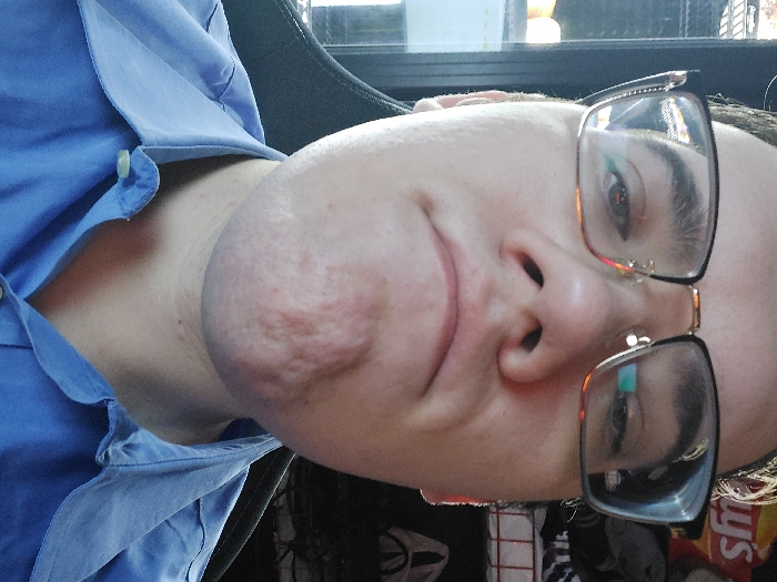 A person with fair skin and short hair wearing glasses and a blue collared shirt is pictured from the chest up. The image is rotated, with the person's left side higher. Their face is slightly tilted towards the viewer, showcasing a small smile. A portion of a grey chair is visible behind their left shoulder. A snack food item is present in the background.