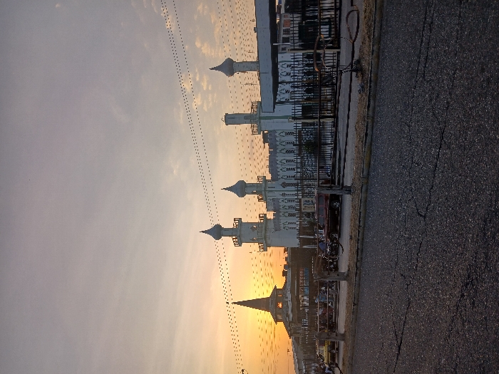 The image displays an outdoor scene in San Diego, Venezuela, captured during either sunrise or sunset. The sky, occupying the upper two-thirds of the frame, exhibits a prominent orange-yellow glow on the left horizon, transitioning to a pale grey-blue with scattered thin clouds overhead. Multiple overhead utility lines with visible insulators traverse the upper portion of the image. In the foreground, a dark asphalt road with visible cracks occupies the bottom third. This road is separated from the midground by a low, light-colored curb and a dark metal fence supported by several wooden posts. Behind this barrier, in the midground, multiple vehicles are visible, including a maroon SUV and a partially discernible yellow sedan. Indistinct figures of individuals are present near these vehicles and structures. To the far left, a multi-tiered structure with a pointed roof is silhouetted against the bright sky. The background is dominated by a prominent white building complex, identifiable as the Centro Comercial Sambil Valencia. This complex is characterized by its distinctive Islamic architectural style, featuring multiple minaret-like towers with domed or pointed tops and intricate ornamental details on its facade. At least five such towers are visible. To the right of the main complex, a dark, covered structure with an overhang is observed.