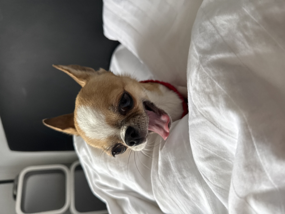 - "A tan and white Chihuahua, wearing a red collar, is partially visible from its head to upper chest, emerging from crumpled white bedding" by FM-eQUGe2, licensed under CC BY 4.0