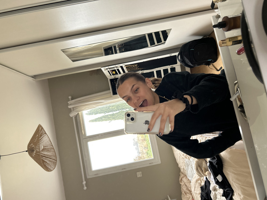 An image taken in Veauchette, France, depicts a female subject capturing a mirror selfie within a bedroom setting. The subject, with her hair pulled back and wearing a black long-sleeved top and gold-toned earrings, holds a white-cased iPhone with dark-painted fingernails, reflecting her image in a large mirror. Her mouth is open in an expressive pose, and a black scrunchie is on her left wrist. The reflected background reveals a room with light taupe walls and a white ceiling from which a woven natural fiber pendant light fixture hangs. A double-paned window with white frames on the left offers a view of a green field, two tall evergreen trees, and an overcast sky. To the right, white sliding wardrobe doors and a tall, partially open jewelry armoire with a mirrored front, displaying various necklaces and earrings, are visible. An unmade bed with light-colored bedding and dark clothing items rests on the lower left. A black backpack with blue accents is positioned on a light wooden floor in the lower right. On the white surface in the unreflected foreground, various cosmetic items, including bottles and lipstick, are arranged.