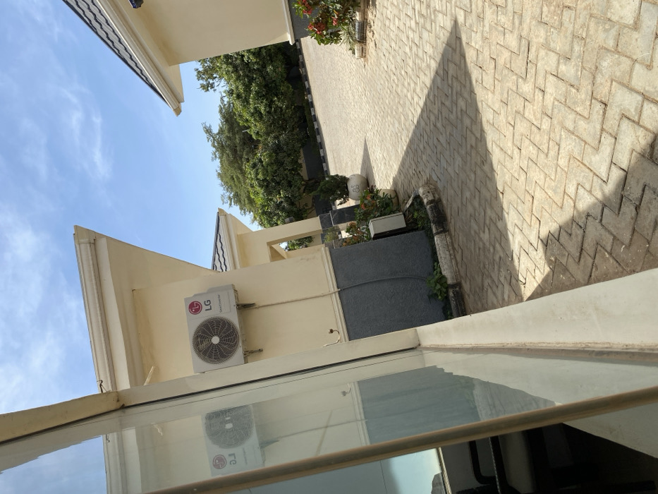 The image presents an outdoor scene in Jos, Nigeria, viewed partially through a vertical window frame on the left. The foreground features light-colored interlocking brick pavers in a herringbone pattern, strongly illuminated by sunlight, casting distinct shadows. Several single-story buildings with light yellow facades, dark grey lower wall sections, and dark grey tiled roofs are visible. On the exterior wall of the nearest building to the left, an LG Smart Inverter air conditioning outdoor unit is mounted, with its reflection visible in the window. Green trees and dense shrubs line the background and perimeter of the paved area. Small flower beds or potted plants are positioned near the building foundations. The sky is clear blue with sparse white clouds. No individuals or specific actions are discernible within the frame.