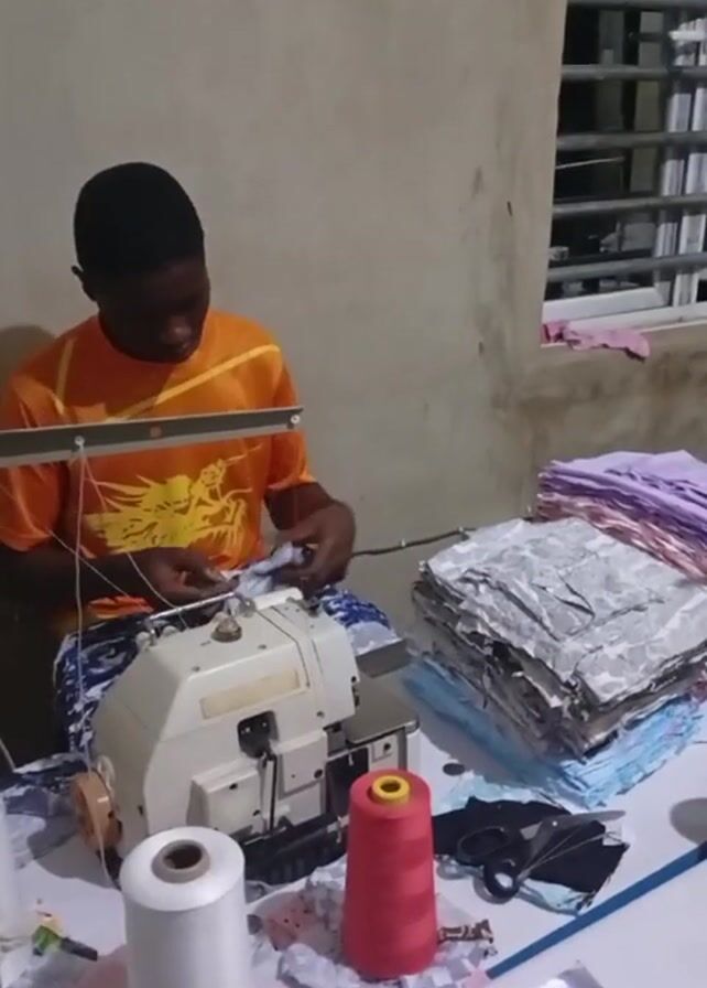 A person is sitting at a table, operating a sewing machine. The person is wearing an orange t-shirt. There are two large spools of thread, one white and one red, on the table, along with a pair of scissors and fabric scraps. To the right of the sewing machine is a large stack of folded fabric pieces. A window with bars is visible in the background. The wall behind the person and the table is a light neutral color.