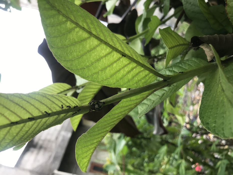 The image depicts a close-up, upward-angled view of a green plant, identified as a Guava (Psidium guajava) plant, located in the city of Bogor, Indonesia. The central focus is a section of a main stem with multiple bright green leaves emanating from it. The leaves display distinct venation, illuminated from behind by natural daylight. Numerous small, black ants are present, actively crawling along the stem and the undersides of the leaves. Concentrated on the main stem, specifically at a nodal point just below a leaf petiole, is a visible cluster of white, fuzzy, and somewhat lumpy organisms. These are consistent with a colony of mealybugs or aphids, indicating an infestation. The ants are observed in close proximity to these insects, suggesting a tending interaction for honeydew collection. The immediate environment is an outdoor garden setting, with blurred green foliage visible in the foreground and background. In the upper left background, a light-colored building structure, possibly a wall or roofline, is discernible. The overall lighting indicates an overcast or diffused bright daylight condition. No human subjects are present in the scene.