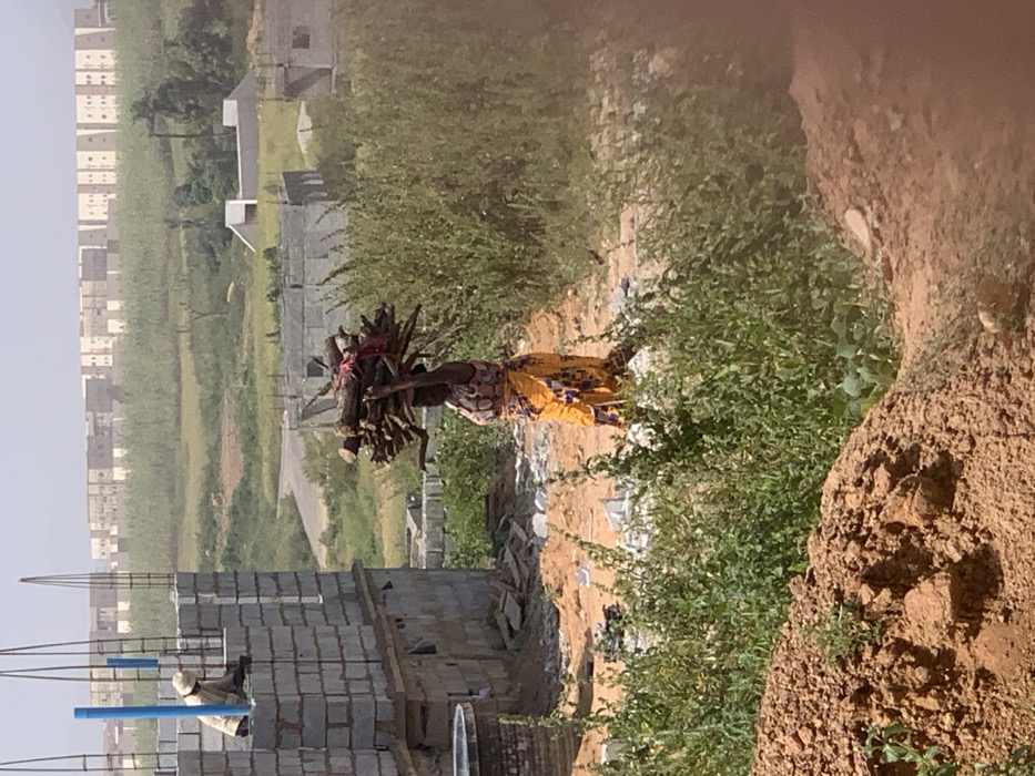 This image depicts an outdoor scene in Karsana 2, Nigeria, under bright daylight conditions. In the mid-ground, a woman walks from left to right, carrying a substantial bundle of firewood secured with a red fabric on her head. She wears a patterned top and a yellow and orange patterned wrap or skirt. Her left arm is slightly raised, supporting the load. To the left of the woman, a man is positioned on an incomplete two-story structure constructed from light grey concrete blocks. He wears a light-colored long-sleeved shirt and a hat, appearing to work on the upper course of blocks. Rebar protrudes vertically from the structure's corners, some encased in blue plastic sheathing. A dark-colored bucket is visible at the base of this structure. The terrain in the foreground consists of reddish-brown earth, with a large mound of soil on the lower left. Green, dense vegetation, including bushes and tall grasses, covers significant portions of the ground, particularly in the immediate foreground and between structures. In the background, numerous partially constructed buildings made of concrete blocks are scattered across the landscape. A winding unpaved road is visible amidst the vegetation and construction sites. Further in the distance, a long row of finished or more developed multi-story buildings with light-colored facades extends horizontally across the horizon. The sky is clear and light-colored.