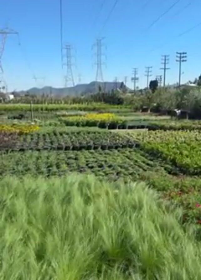 wide shot of a nursery filled with rows of plants. In the foreground is a patch of tall, feathery green grass gently swaying in the wind. Behind the grass, several rows of potted plants are visible, including what appear to be flowers and shrubs. Some of the plants have yellow blooms. In the distance, power lines and towers are strung across the sky, with hills or mountains visible in the background under a clear blue sky. The scene gives the impression of a sunny, calm day at a plant nursery.