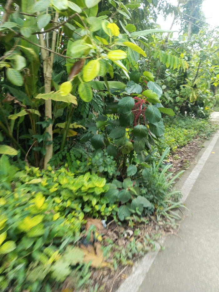 Lush greenery lines a roadside. Various plants flourish, including broad-leafed species, ferns, and trees with bright green leaves. A plant with distinctive red, tassel-like flowers stands out amidst the dense foliage. A concrete path edges the vegetation, marking the boundary between the natural growth and the built environment. The scene is vibrant and full of life, showcasing the beauty of nature along a roadside.