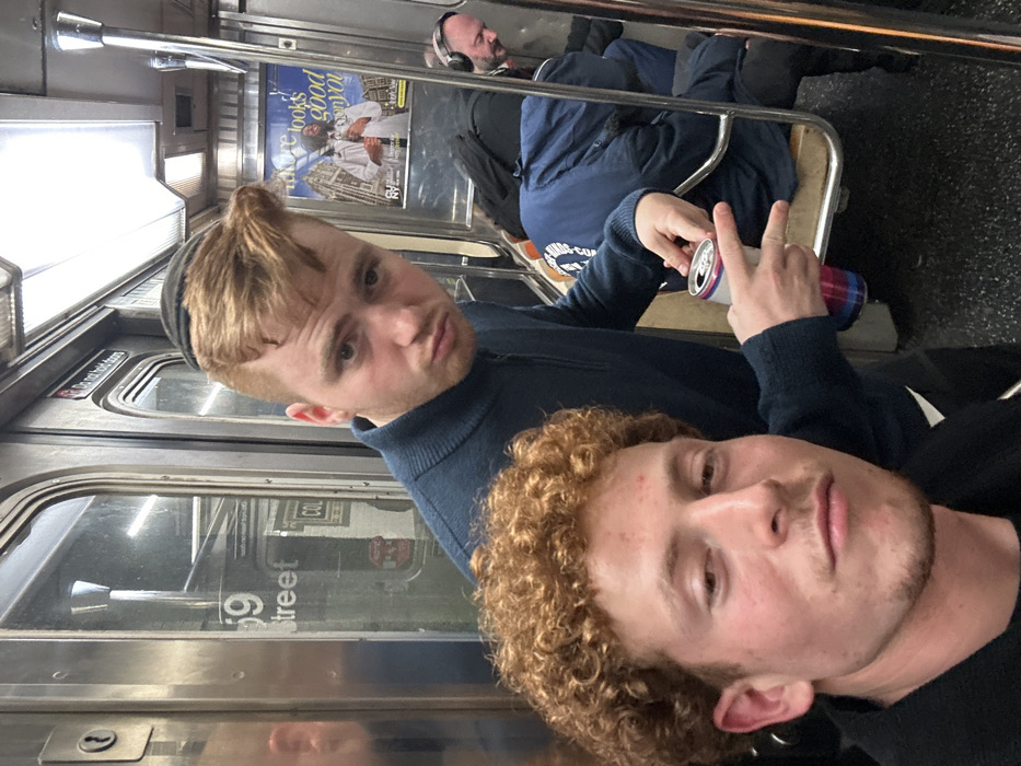 Two men are posing inside a subway car. The man in the foreground has curly red hair and a light complexion. Behind him, another man with a kippah on his head is holding an open can and making a peace sign. In the background, a person wearing headphones is reclining. An advertisement is visible above them. The train door with "59 street" printed on it can be seen on the left side of the frame.