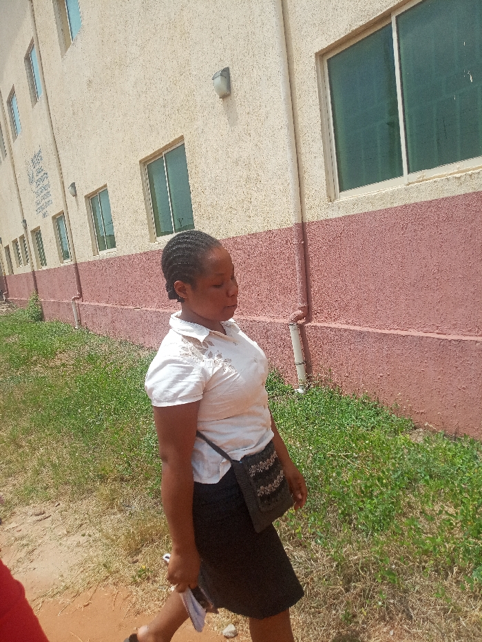 The scene is set outdoors in Ukwu-Abwa, Nigeria, adjacent to a two-story building. A Black female is prominently positioned in the center, walking from the right side of the frame towards the left. She has dark, braided hair pulled back. She is attired in a white short-sleeved collared shirt featuring embroidered or cut-out details on the shoulders and upper chest, a dark, possibly black, skirt, and a dark shoulder bag with a patterned front slung across her body. She holds a white rectangular object, consistent with a mobile phone, in her right hand. Her facial expression is neutral, with her gaze directed slightly downwards. A portion of another individual's arm, clad in a red sleeve, is visible in the lower-left corner of the image. The background consists of a two-story building with a light beige, textured upper facade and a distinct reddish-brown band along the lower portion. Multiple rectangular windows with light-colored frames and tinted glass are visible on both floors. Two wall-mounted light fixtures are present on the beige section of the wall, and several light-colored vertical drainpipes descend the reddish-brown section. A dark plaque or sign with white, illegible text is affixed to the building's facade on the far left. The ground in the foreground transitions from an exposed reddish-brown dirt path on the left to an area of green grass and weeds closer to the building. The scene is illuminated by bright daylight.