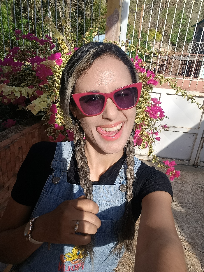 A fair-skinned female, possibly in her 20s or 30s, is depicted in a close-up, chest-up selfie, making a playful expression with her tongue slightly extended and a wide smile, located in Trapiche del Medio, Venezuela. She wears large red cat-eye sunglasses with dark lenses, a black short-sleeved top, and light blue denim overalls featuring an embroidered Tweety Bird character on the chest. Her hair is parted and styled into two braids, one visible over each shoulder, with highlights of light brown or blonde. A silver-colored ring with a clear stone is visible on the ring finger of her left hand, which is held loosely in front of her chest, partially obscured by the overalls. A watch with a light-colored band and a round face is on her left wrist. The background shows a sunny outdoor environment. Behind the woman, a dense bush with vibrant pink and white-yellow bougainvillea flowers is visible. Further back, a metal fence or gate structure, painted white, is present. Beyond the fence, a sloping terrain covered in green vegetation and trees is visible, suggesting a hillside. Distant structures, possibly residential buildings, are partially visible through the foliage and fence. Sunlight casts distinct shadows on the woman's right arm and across parts of the background, indicating strong overhead lighting. The ground appears to be a light-colored paved or concrete surface.