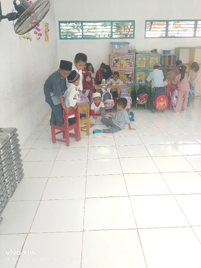 This image displays an active indoor children's area or classroom located in Jagapura Kidul, Indonesia. The room features white tiled flooring, white painted walls, and two blue-framed horizontal windows on the far wall, revealing green foliage outside. A silver, wall-mounted oscillating fan is affixed to the upper left wall. Against the far wall, colorful wooden storage units, one adorned with Mickey Mouse imagery, are visible alongside an open shelving unit. Small tables and plastic chairs are arranged in the background, with numerous children's backpacks, including one featuring a superhero motif, placed on or beside them. Approximately 15 to 20 young children are present; several boys wear peci caps and girls wear headscarves. In the left foreground, a boy wearing a black peci and dark grey clothing stands atop a red wooden chair. He interacts with another boy, also in a peci and a white uniform-like shirt, who leans on the red chair and an adjacent yellowish-brown chair. A third boy, wearing a white peci and a red-collared white shirt, sits on the floor directly in front of these chairs, appearing to adjust his footwear. To his immediate right, a fourth boy in a light blue shirt and dark grey pants sits on the floor. In the mid-ground and background, other children are seated at tables, some engaged with books or papers. A tall stack of rectangular, metallic containers rests against the lower left wall. The image bears a visible timestamp of "13 Okt 2025, 08:48".
