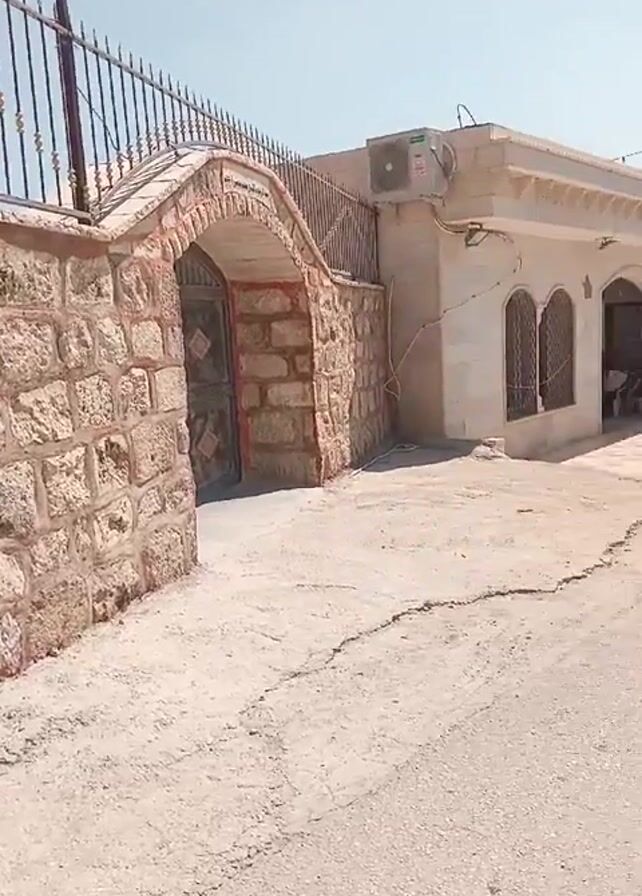 The camera slowly pans across a street in what appears to be a Middle Eastern town. The road is concrete and has some cracks. A stone wall with a metal gate and arched doorway is on the left side of the screen. A one-story building with an air conditioning unit is visible nearby. Across the street are several buildings, cars parked under a shaded awning, and a mosque minaret in the distance. Power lines stretch across the sky. The sky is clear blue, and the lighting suggests it is daytime.