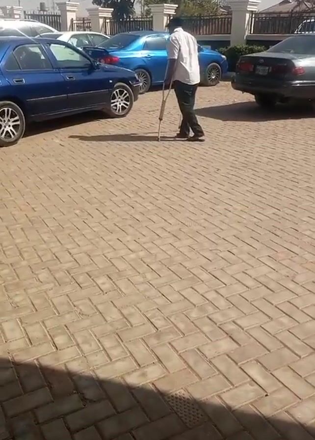 man walking with crutches across a brick-paved parking lot. He is wearing a white shirt and dark pants. Several cars are parked in the lot, including a blue car on the left, a teal car behind it, and a dark gray car on the right. There are buildings in the background, partially obscured by trees. The sky is clear and the sun is shining, casting shadows on the brick pavement.