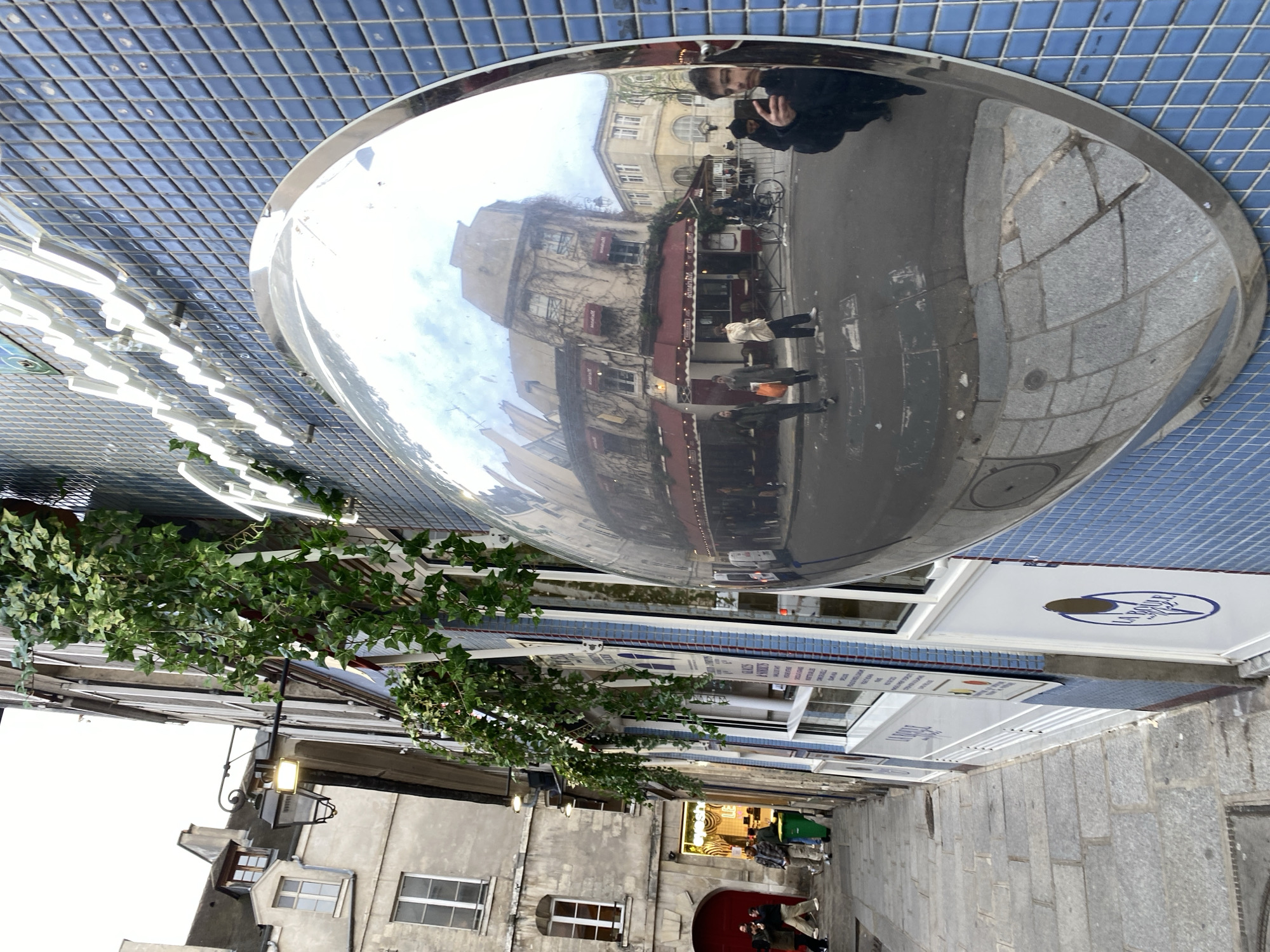 An outdoor scene on Rue des Martyrs in Paris, France, depicts a narrow street under an overcast sky. The viewpoint is from a sidewalk, looking along a building facade on the right, which is tiled with small, square blue tiles. A large, circular convex security mirror is mounted on this tiled wall. Above the mirror, artificial green ivy cascades, and white neon-style lettering is partially visible. Below the tiled section, white panels feature "LA BOULE" and text in French indicating an establishment selling ice cream and waffles. To the left, a paved sidewalk extends past historic, light-colored stone buildings with multiple windows and pitched roofs; one building displays a prominent dormer window. A black, ornate streetlamp extends from a building facade. Several pedestrians walk along this sidewalk; one person is carrying a green bag, and a green public waste bin is visible. Further down the street, an arched entryway and a storefront with a yellow "Eyewish" sign are visible. The convex mirror prominently reflects the street opposite. A multi-story building with a light-colored facade, covered in ivy, features multiple windows and red retractable awnings over its ground floor, indicating a café or restaurant with outdoor seating. Patrons and pedestrians are visible on the opposite sidewalk and street. A bicycle is parked near the reflected cafe. The photographer, wearing a dark jacket and beanie and holding a smartphone, is distinctly visible in the lower right quadrant of the mirror's reflection.