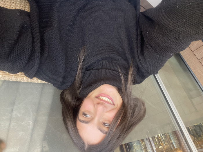 A light-skinned female individual, appearing to be a young adult, is captured in a close-up, self-portrait style photograph. She has dark brown, shoulder-length hair and is smiling broadly, with her head slightly tilted, gazing towards the viewer's upper left. She is wearing a dark, likely black, knit turtleneck sweater, which shows visible light-colored lint or fibers, particularly on the sleeves. Her left arm, extended to hold the camera, is partially visible in the lower right of the frame. The background on the left consists of a large glass window reflecting an indistinct interior, possibly a retail space, with a light-colored wooden panel below it. On the right, a section of a light-brown wicker or woven chair back is visible, indicating an outdoor or semi-outdoor seating environment. The scene is brightly illuminated by natural light, suggesting a daytime setting within a commercial or promenade area in the city of La Grande-Motte, France.