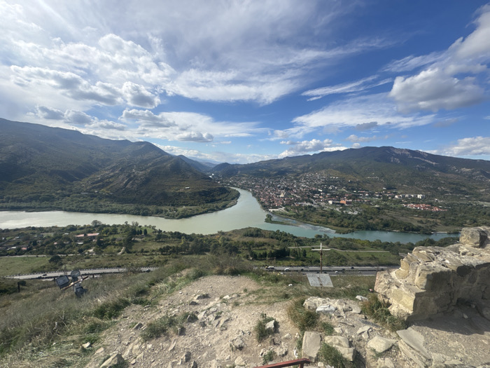 - "The image displays an elevated panoramic view from Jvari Monastery in Mtskheta, Georgia" by FM-Sep6K2, licensed under CC BY 4.0