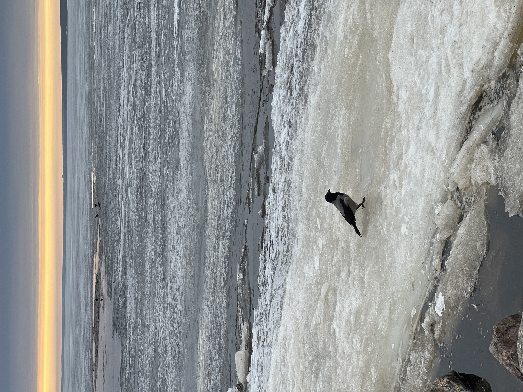 The photograph depicts a winter scene in Sestroretsk, Russia. A hooded crow stands on a snow-covered ice formation near a body of water, possibly the Gulf of Finland. The ice extends towards the water, with visible cracks and fissures. In the background, the water surface is partially frozen, reflecting the light from a low-hanging sun or approaching sunset. The sky transitions from grey to a warm yellow-orange near the horizon. Additional birds are visible in the distance on the icy water. The photo is taken from a slightly elevated angle, looking down at the crow. Rocks are visible on the bottom right.