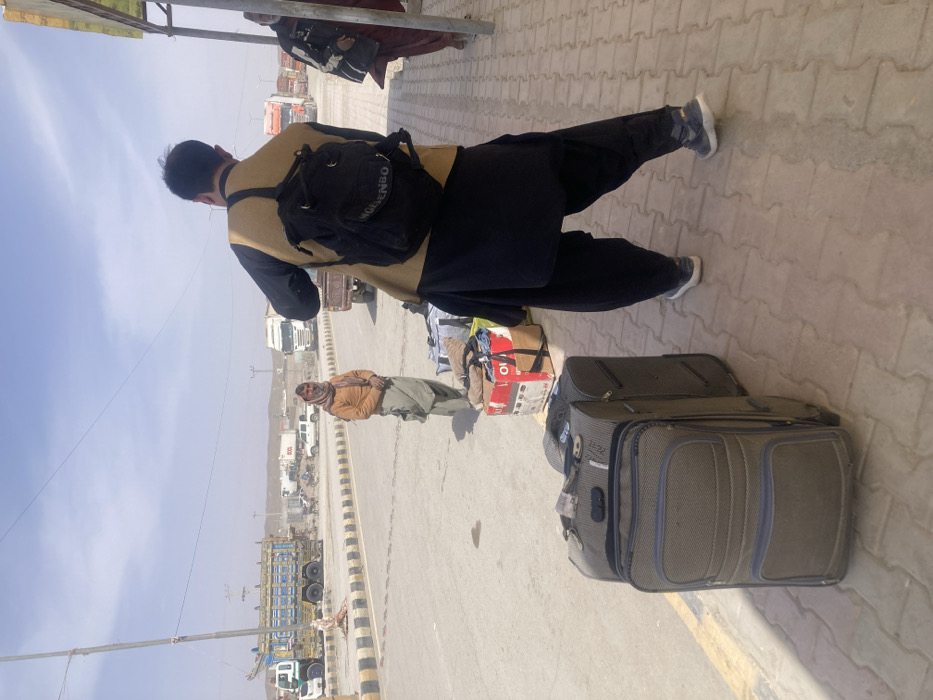 The image depicts an outdoor scene in Kuh-i-Taftan, Pakistan, under a clear, bright sky. The perspective is from a paved sidewalk, looking across a road towards a dusty, arid landscape with distant hills. In the immediate foreground, two grey wheeled suitcases are positioned on the light-colored paver sidewalk. Directly behind them, several bags and a cardboard box, marked with "O" and containing textiles, are placed on the ground. A male figure stands with his back to the camera on the sidewalk, wearing a black long-sleeved garment, baggy black trousers, a light tan vest, and dark athletic shoes. A black backpack with "MODENBO" in white text is worn on his back. His body is oriented towards the road. To the left of this figure, in the middle ground on the road, another male individual stands facing the camera. He wears an orange-brown top, light-colored baggy trousers, and a patterned scarf wrapped around his head and neck. He has a beard. A yellow and black striped concrete barrier separates the sidewalk from the main road, which is busy with vehicle traffic. Numerous large trucks, including a distinctive blue, green, and yellow decorated truck, a white semi-trailer truck, and other commercial vehicles, are visible parked or in motion on the road. A white pickup truck is also present. In the far background, the terrain consists of low, dusty hills. A tall, thin metal pole is visible on the left side of the road. Another individual is partially visible on the far right edge of the frame, behind the person with the backpack, wearing dark clothing.