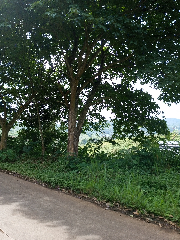 The image captures an outdoor scene in Matale, Sri Lanka, depicting a natural and semi-rural landscape. A grey paved road occupies the lower left portion of the frame, showing shadows cast upon its surface. Adjacent to the road, a strip of dense green vegetation and taller grasses forms a verge. Beyond this, several large deciduous trees with thick brown trunks and full canopies of green leaves dominate the midground, with smaller plants and undergrowth visible beneath them. In the background, a valley with cultivated fields, appearing light green, extends towards a horizon marked by distant hills or mountains under a bright sky. A small, light-colored roof is partially visible on the far right side of the background. No people or active subjects are present within the frame.