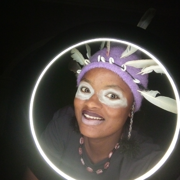 A person with dark skin, wearing a lavender hat adorned with feathers and shells, stands within a bright ring light. White paint is applied around the eyes and a necklace of purple beads encircles the neck. The person wears a dark purple shirt and smiles, revealing teeth colored a similar shade. A long, braided earring with a fuzzy embellishment is visible on the left side of the face. The background is dark, emphasizing the ring light and the person's face.