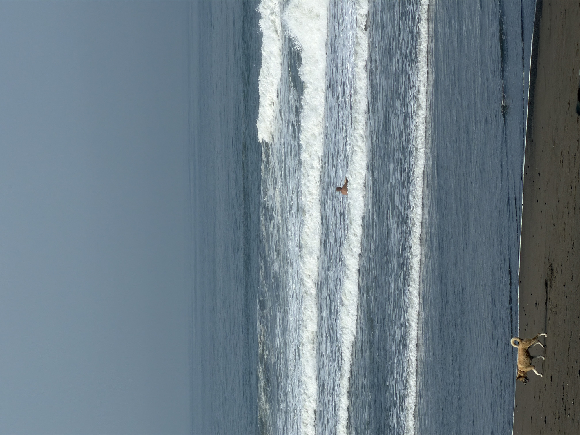 This image depicts a coastal scene on a hazy day in Belalang, Indonesia. The foreground features a dark sandy beach where a light brown dog, with a curled tail, walks from left to right, near the water's edge. In the midground, the ocean is characterized by multiple lines of breaking white-capped waves. A single, shirtless individual, an adult, is partially submerged in the water, positioned between two prominent waves, seemingly interacting with the surf. The background consists of calm, darker blue water extending towards a distant horizon, which merges indistinctly with a uniform, light blue-grey sky. There are no other discernible structures or individuals.