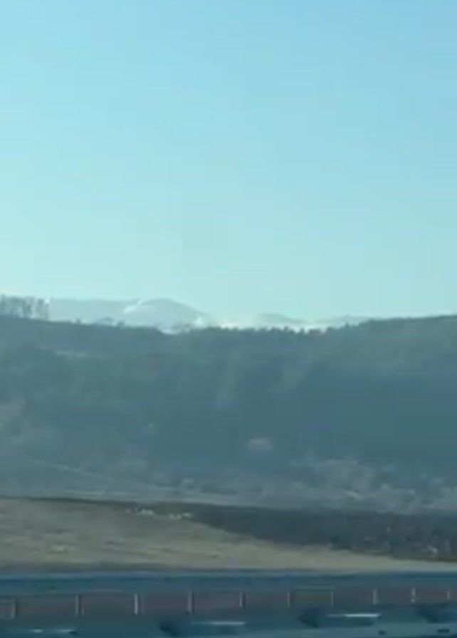 landscape seen from a moving vehicle, likely a car, traveling on a highway. A gray guardrail is visible in the foreground, along with a field and some low-lying vegetation in the middle ground. Beyond this, there is a forested area with hills, and in the far distance, there are snow-capped mountains under a clear blue sky. The overall impression is one of a sunny, peaceful drive through a rural area. A highway sign is visible near the middle of the video.