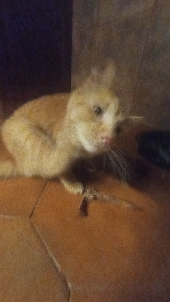 An orange tabby cat crouches on a brown tiled floor. The cat appears alert, with dilated pupils and forward-facing ears. Its whiskers are prominent, and its fur has a slightly blurred appearance. A dark object is visible to the right of the cat. The background features a dark area, suggesting low lighting conditions.