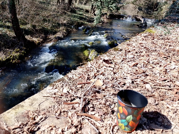 The image captures an outdoor natural scene on a bright, sunny day. A small, clear stream with turbulent water flowing over rocks occupies the left side of the frame, originating from the upper left and moving towards the lower left. The stream's immediate right bank consists of a light-colored, possibly concrete or stone, structure partially obscured by dry leaves. The ground extending from this bank into the foreground and midground is densely covered with dry, brown fallen leaves, small twigs, and seed pods. In the bottom right quadrant, a black-rimmed cup with a colorful pattern of orange, green, and blue leaves stands upright on the leaf-covered ground, casting a distinct shadow to its right. The background features a dense stand of deciduous trees, mostly bare of leaves, suggesting late autumn or early spring. No individuals or man-made structures indicative of a specific city or town are present, locating the scene in a natural, wooded area.