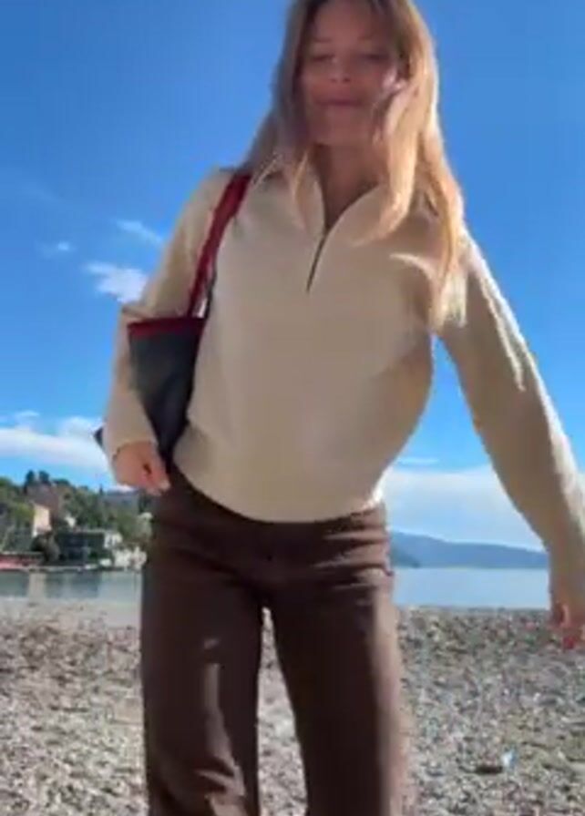 A woman stands on a pebbled beach under a bright blue sky with scattered clouds. She is facing the camera, then straightens up, placing her hands on her hips. She is wearing a light beige sweater, dark brown pants, and shoes of similar tone to the sweater. She has shoulder-length blond hair with bangs. A black purse with a red strap hangs from her shoulder. In the background, across the water, is a town with buildings and trees, and distant mountains.