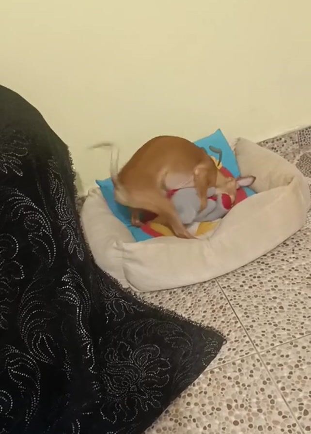 small, tan-colored dog inside a cream-colored dog bed. The dog is in a standing position and appears to be humping a pillow within the bed. The pillow is blue with a colorful design. The dog's tail is wagging. The dog bed sits on a tiled floor near a wall that is pale yellow. A black, patterned cloth-like object is visible in the foreground to the left. In the bottom left, there is a glimpse of a blue object that is partially obscured.