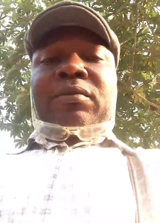 A medium shot shows a man wearing a plaid shirt and a hat, with sunglasses around his neck, looking directly at the camera. He is outside, as leafy green trees are visible in the background, with a bright, almost overexposed sky. The camera is held at a low angle, looking up at the man. He does not speak or make any other distinct movement. The lighting is bright, and the overall setting appears to be outdoors during daylight hours. The video quality is slightly grainy.