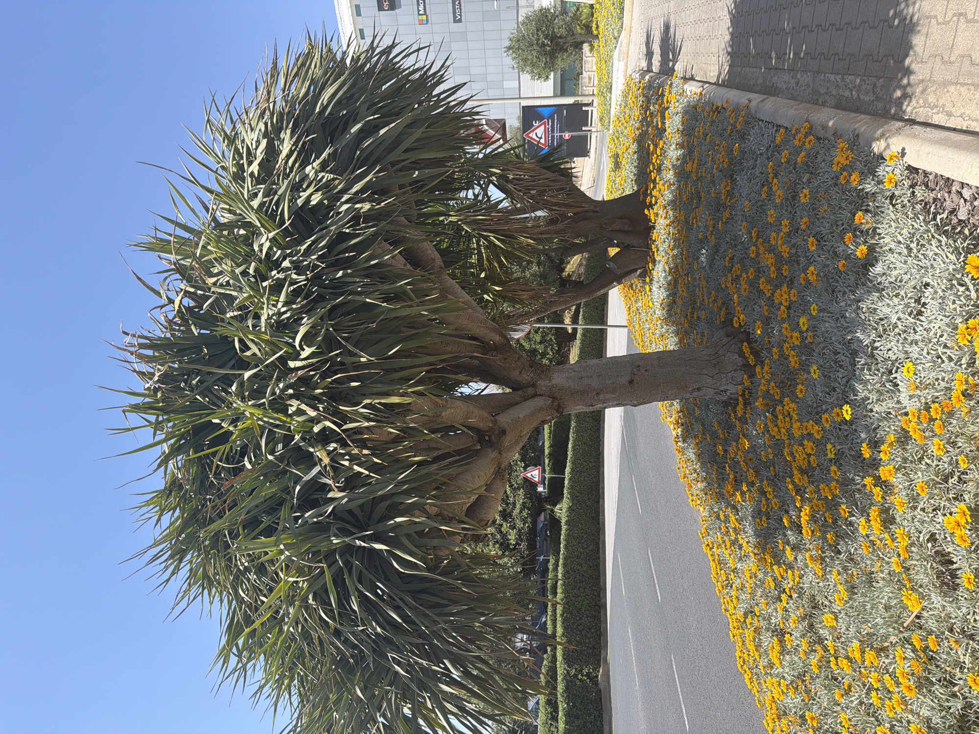 view in Gudja, Malta, featuring a mature dragon tree (Dracaena draco) with multiple branches, positioned adjacent to a road. The tree's foliage consists of dense, spiky, green leaves. At the base of the tree, and extending along the roadside, there's a bed of yellow daisy-like flowers with silver-gray foliage. Behind the flowers is a paved sidewalk with a concrete curb. Across the road is a trimmed hedge and a street sign. In the background, partially visible, is a building with signage including "Microsoft" and "Vista." The sky is clear and blue. The perspective of the photo is slightly tilted. The road appears to be relatively empty, and no people are visible.