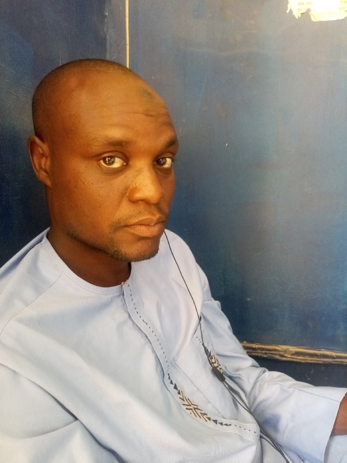 A waist-up portrait captures an adult male, appearing to be of African descent, positioned centrally and looking directly forward