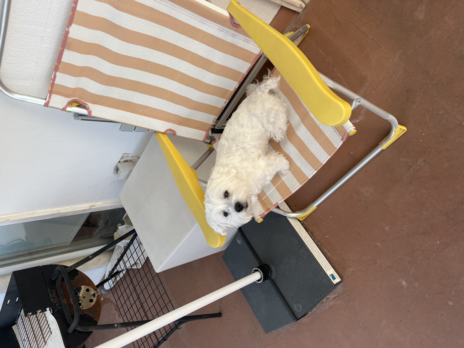 - "A white Maltese-type dog is seated centrally on a folding lounge chair with orange and white striped fabric and yellow plastic armrests" by FM-XmQCg2, licensed under CC BY 4.0
