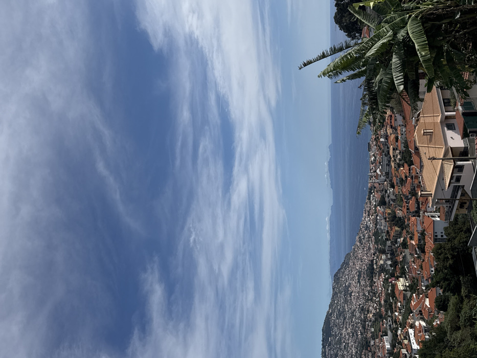 This image presents an elevated panoramic view of Funchal, Portugal. The upper half of the frame displays a clear blue sky interspersed with wispy white cirrus clouds. Below the sky, the deep blue Atlantic Ocean extends to the horizon, where faint outlines of distant landmasses, likely islands, are visible. The city of Funchal occupies the mid-ground, characterized by a dense array of buildings with predominantly terracotta-tiled roofs, situated on a sloping hillside that descends towards the coastline. Green trees and other vegetation are interspersed among the urban structures. A distinct white building featuring a prominent spire, indicative of a church or public edifice, is visible within the central-right portion of the city's expanse. In the immediate foreground, the tiled roof and light-colored facade of a building are partially visible in the lower center, while dense green foliage and large, broad-leaved tropical plants obscure a portion of the view on the right. No human figures or specific activities are discernible. The scene is illuminated by bright daylight.