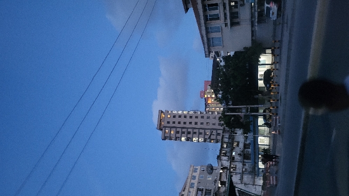 An urban view with a tall building as the focal point, illuminated with lights. The sky is a mix of blue and cloudy, traversed by power lines. Adjacent buildings are also visible, along with trees lining the street. The composition suggests an evening setting, with a section of the street and sidewalk appearing in the foreground.