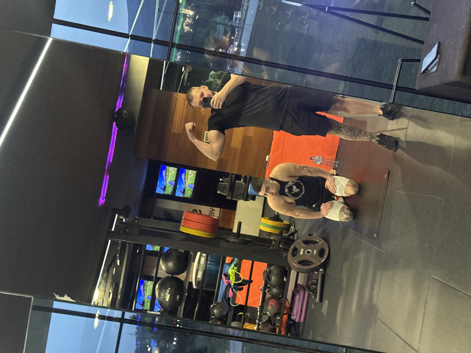 The image depicts two males inside a modern fitness gym, reflected in a large mirror