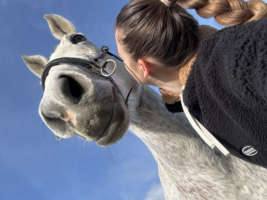 A close-up, low-angle image depicts a grey horse interacting with a person outdoors in Estaimpuis, Belgium