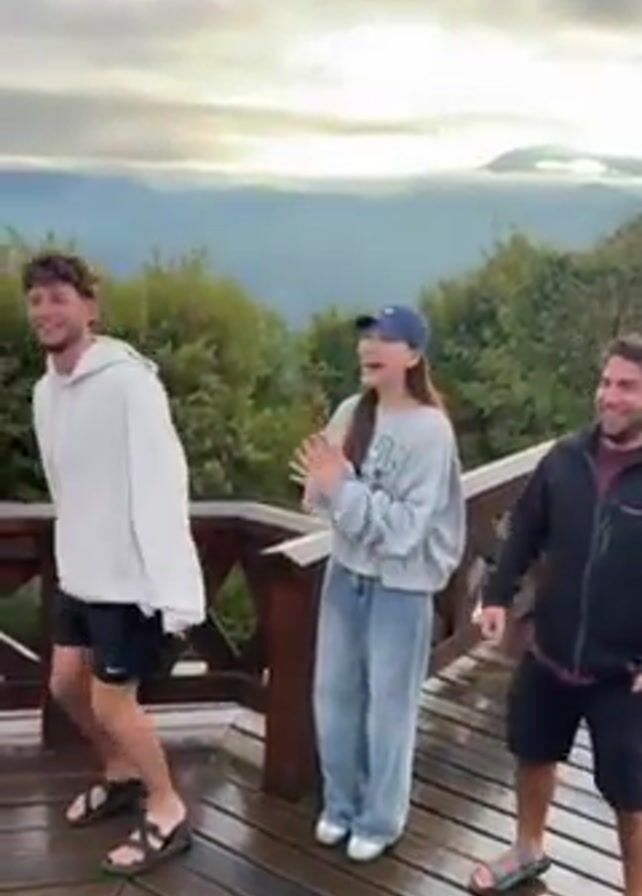 Three young adults are on a wooden deck overlooking a mountain range under a cloudy sky. The person on the left, a male, wears a white hoodie, black shorts, and slides. He jumps excitedly. The person in the middle, a female, wears a gray sweatshirt, blue jeans, a blue cap, and white sneakers. She claps. The person on the right, a male, wears a black jacket, black shorts, and slides. He also jumps, grabbing the female's arm. After the jumps, all three laugh and stand together.